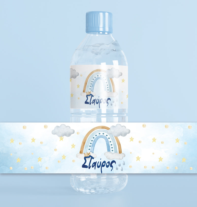 Διακοσμήστε τα μπουκαλάκια νερού με ετικέτες σε θέμα το Ουράνιο Τόξο σε αγορίστικες αποχρώσεις που μπορούν να αναγράφουν το όνομα του παιδιού.