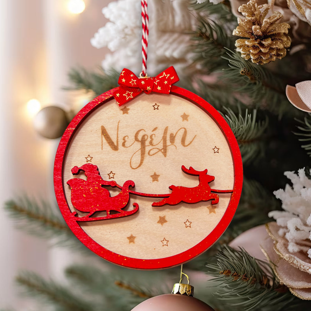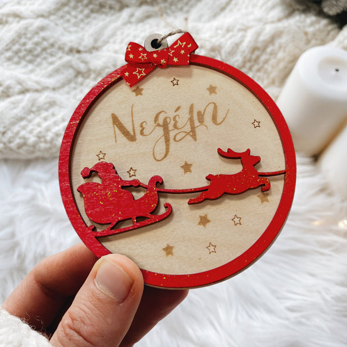 Ξύλινο σχηματικό χριστουγεννιάτικο στολίδι με όνομα και σχέδιο έλκηθρο του Αϊ-Βασίλη σε κόκκινο χρώμα, για να χαρίσετε στους αγαπημένους σας και να τους δείξετε πόσο πολύ τους νοιάζεστε!