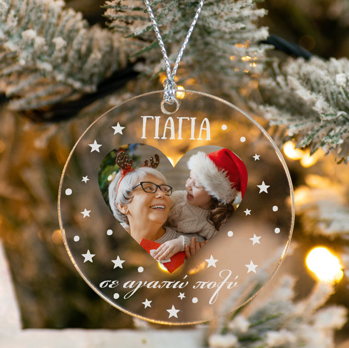 Χριστουγεννιάτικο στολίδι από plexiglass με φωτογραφία σε σχήμα καρδιάς, για να το χαρίσεις στη γιαγιά σου ώστε να στολίσει το δέντρο με τον πιο γλυκό τρόπο!