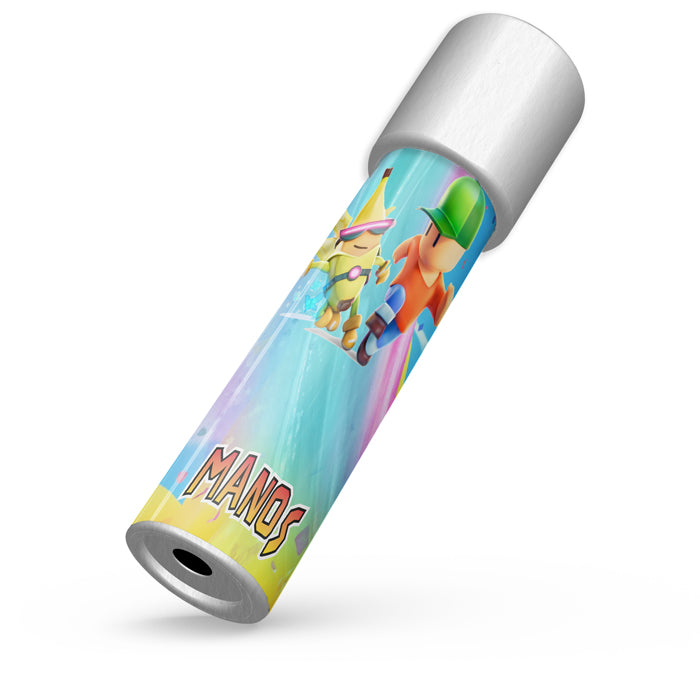 Καλειδοσκόπιο με θέμα Stumble Guys, που το περιστρέφεις και αποκαλύπτονται αμέτρητα σχέδια! Ιδανικό για δώρο στους μικρούς καλεσμένους του πάρτυ, που θα τους μαγνητίσει και θα τους οδηγήσει σε ένα ατελείωτο παιχνίδι με τις αντανακλάσεις του φωτός.