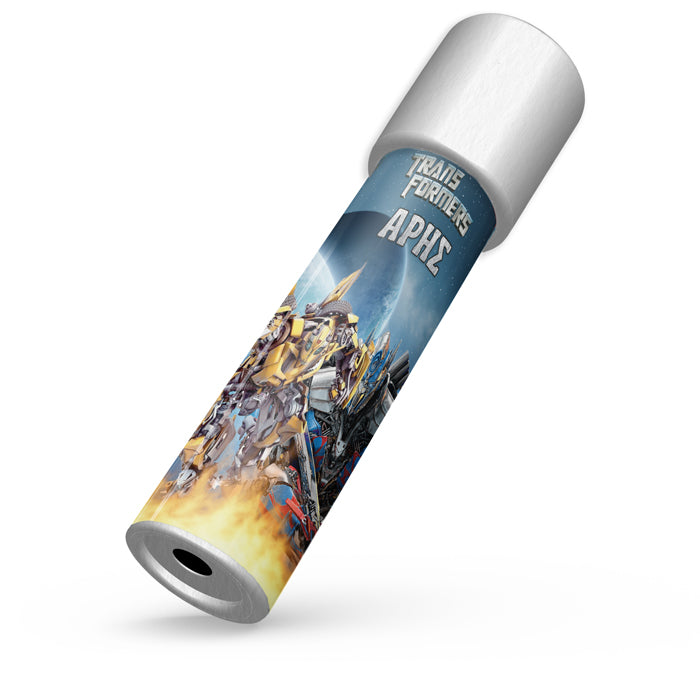 Καλειδοσκόπιο με θέμα Transformers, που το περιστρέφεις και αποκαλύπτονται αμέτρητα σχέδια! Ιδανικό για δώρο στους μικρούς καλεσμένους του πάρτυ, που θα τους μαγνητίσει και θα τους οδηγήσει σε ένα ατελείωτο παιχνίδι με τις αντανακλάσεις του φωτός.