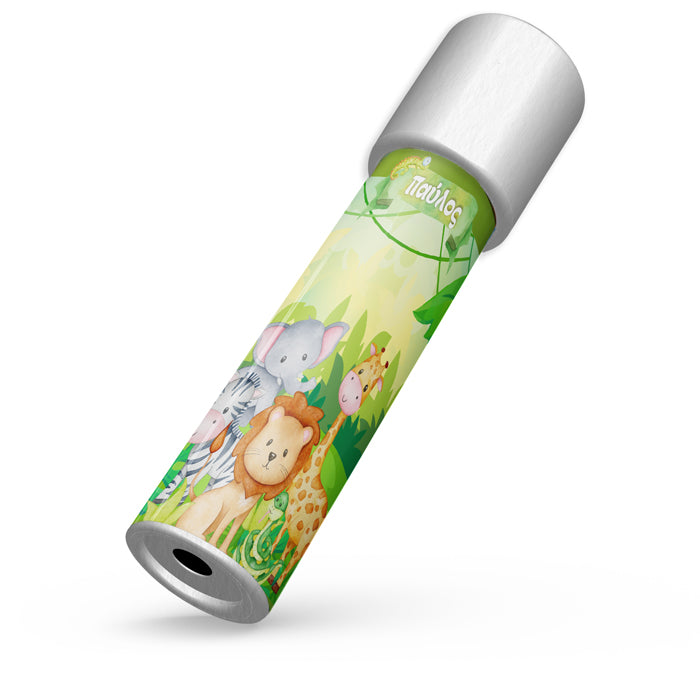 Καλειδοσκόπιο με θέμα Ζώα της Ζούγκλας, που το περιστρέφεις και αποκαλύπτονται αμέτρητα σχέδια! Ιδανικό για δώρο στους μικρούς καλεσμένους του πάρτυ, που θα τους μαγνητίσει και θα τους οδηγήσει σε ένα ατελείωτο παιχνίδι με τις αντανακλάσεις του φωτός.