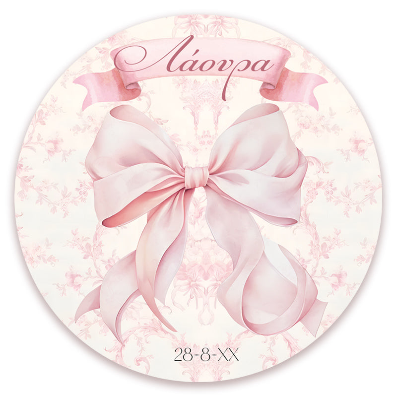 Στρογγυλή αφίσα από μουσαμά με θέμα Ροζ Φιόγκος, για να διακοσμήσετε το χώρο της βάπτισης του μωρού σας!