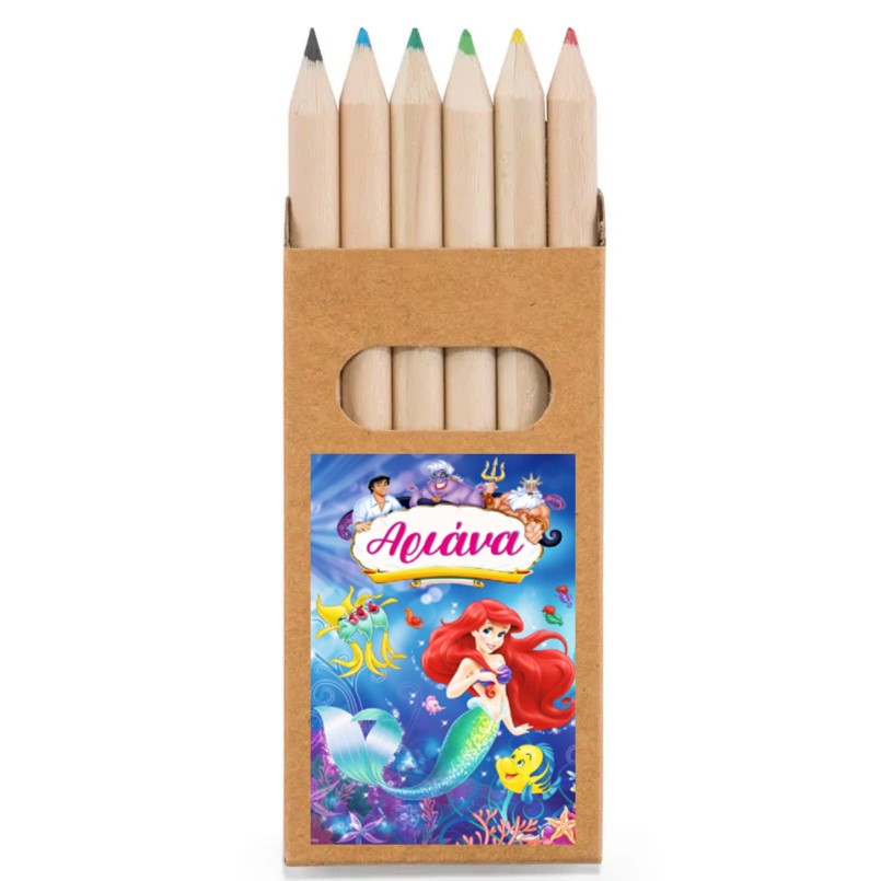 Προσωποποιημένες ξυλομπογιές σε κραφτ τετράγωνο κουτάκι με θέμα Άριελ η μικρή γοργόνα, για να χαρίσετε στους καλεσμένους του πάρτυ.