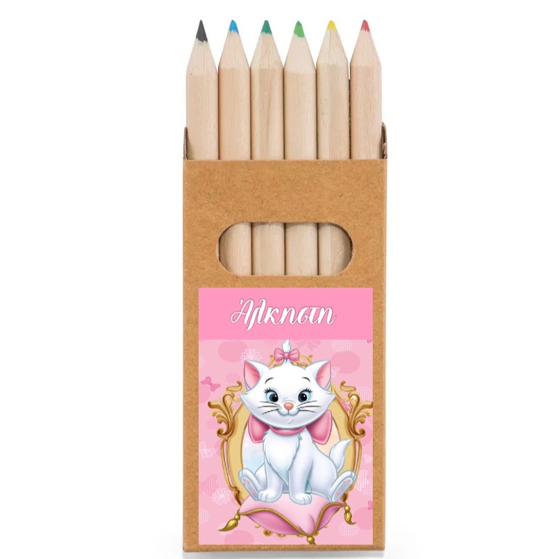 Προσωποποιημένες ξυλομπογιές σε κραφτ τετράγωνο κουτάκι με θέμα Αριστόγατες, για να χαρίσετε στους καλεσμένους του πάρτυ.