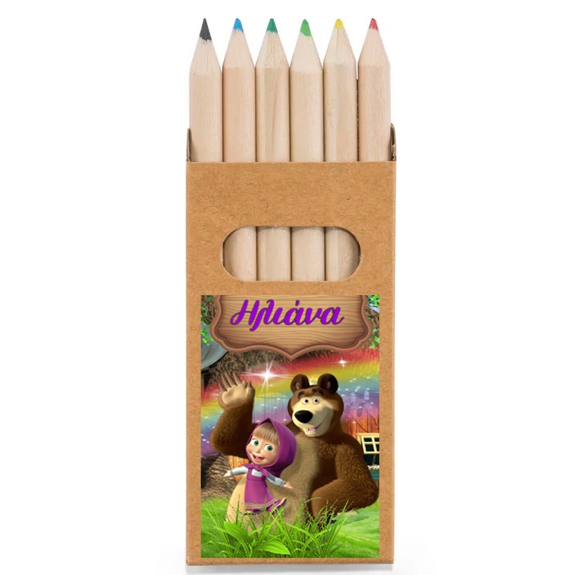 Προσωποποιημένες ξυλομπογιές σε κραφτ τετράγωνο κουτάκι με θέμα Μάσα και Αρκούδος, για να χαρίσετε στους καλεσμένους του πάρτυ.