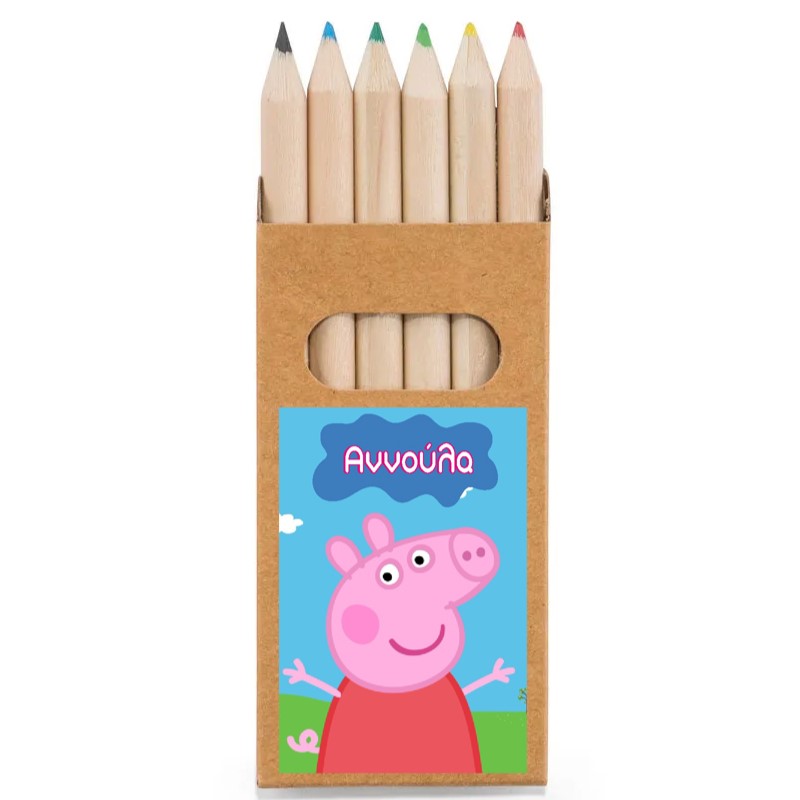 Προσωποποιημένες ξυλομπογιές σε κραφτ τετράγωνο κουτάκι με θέμα Πέππα το Γουρουνάκι, για να χαρίσετε στους καλεσμένους του πάρτυ.