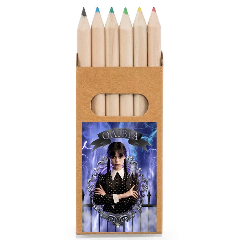 Προσωποποιημένες ξυλομπογιές σε κραφτ τετράγωνο κουτάκι με θέμα Wednesday, για να χαρίσετε στους καλεσμένους του πάρτυ.