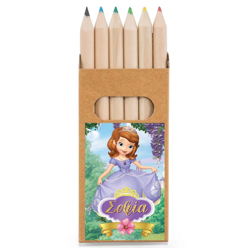 Προσωποποιημένες ξυλομπογιές σε κραφτ τετράγωνο κουτάκι με θέμα Πριγκίπισσα Σοφία, για να χαρίσετε στους καλεσμένους του πάρτυ.