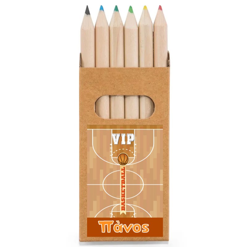 Προσωποποιημένες ξυλομπογιές σε κραφτ τετράγωνο κουτάκι με θέμα Μπάσκετ, για να χαρίσετε στους καλεσμένους του πάρτυ.