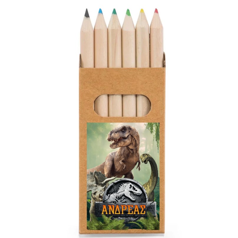 Προσωποποιημένες ξυλομπογιές σε κραφτ τετράγωνο κουτάκι με θέμα Jurassic World, για να χαρίσετε στους καλεσμένους του πάρτυ.