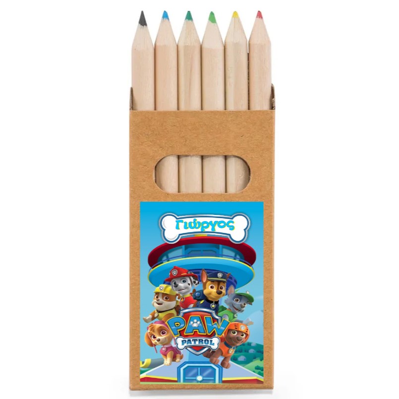 Προσωποποιημένες ξυλομπογιές σε κραφτ τετράγωνο κουτάκι με θέμα Paw Patrol, για να χαρίσετε στους καλεσμένους του πάρτυ.