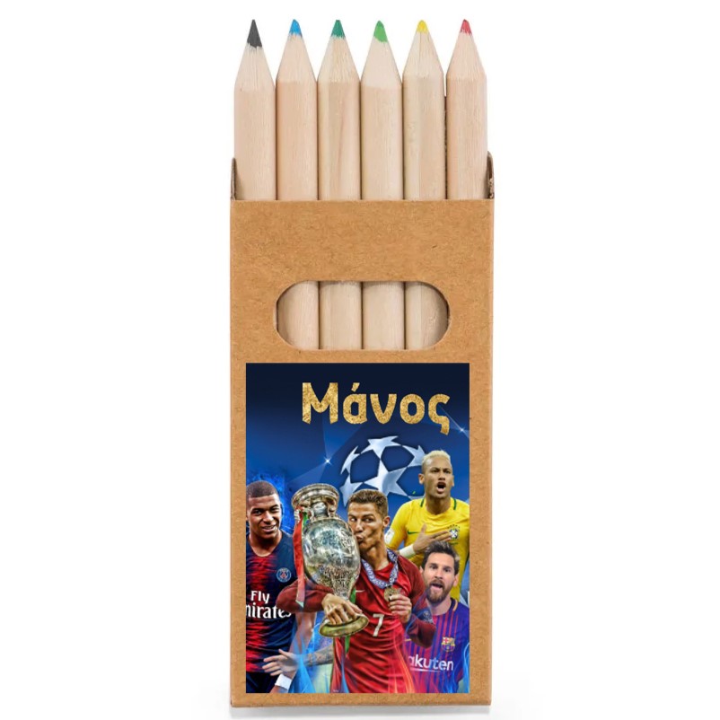 Προσωποποιημένες ξυλομπογιές σε κραφτ τετράγωνο κουτάκι με θέμα Ποδόσφαιρο, για να χαρίσετε στους καλεσμένους του πάρτυ.