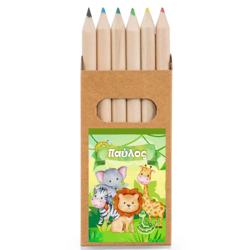 Προσωποποιημένες ξυλομπογιές σε κραφτ τετράγωνο κουτάκι με θέμα Ζώα της Ζούγκλας, για να χαρίσετε στους καλεσμένους του πάρτυ.