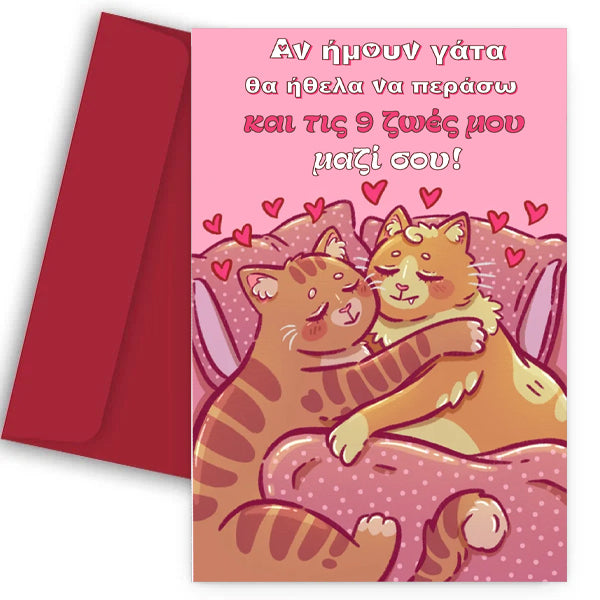 Ευχετήρια κάρτα με σχέδιο ερωτευμένα γατάκια και γλυκό μήνυμα "Αν ήμουν γάτα... θα ήθελα να περάσω και τις 7 ζωές μου μαζί σου!"