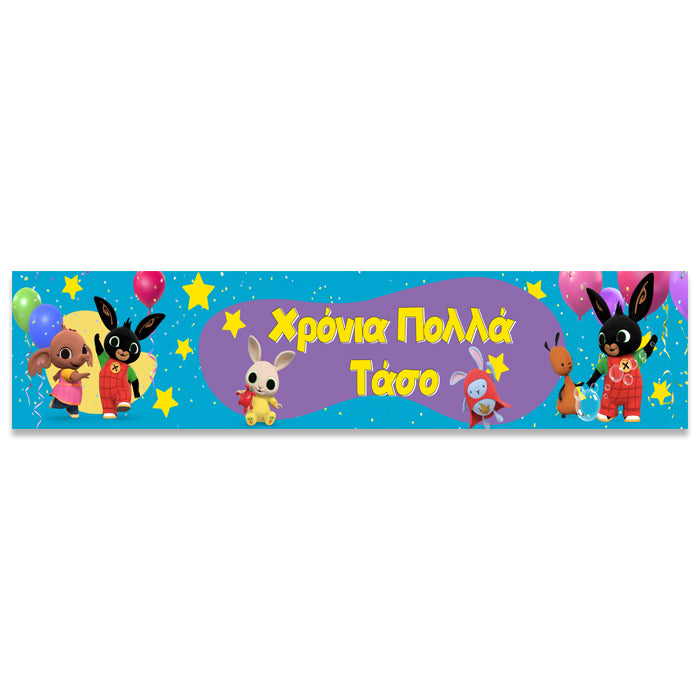 Banner πάρτυ με θέμα Bing και τυπωμένο το όνομα της επιλογής σας! Μπορεί να χρησιμοποιηθεί ως runner για τη διακόσμηση του τραπεζιού ή ως banner στην πόρτα ή τον τοίχο.