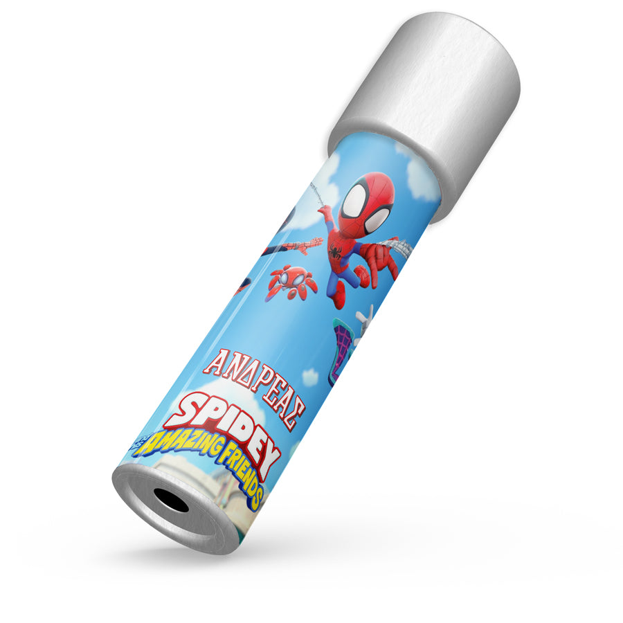Καλειδοσκόπιο με θέμα Spidey, που το περιστρέφεις και αποκαλύπτονται αμέτρητα σχέδια! Ιδανικό για δώρο στους μικρούς καλεσμένους του πάρτυ, που θα τους μαγνητίσει και θα τους οδηγήσει σε ένα ατελείωτο παιχνίδι με τις αντανακλάσεις του φωτός.