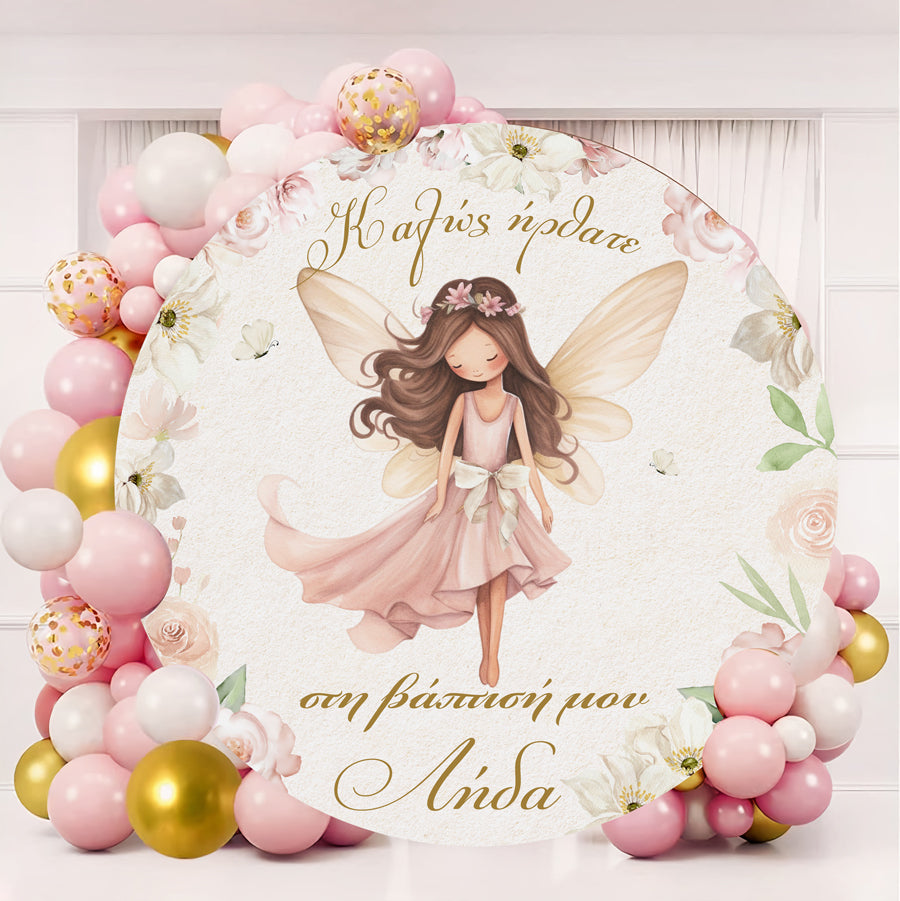 Στρογγυλή αφίσα με θέμα Νεραϊδοχώρα και εκτυπωμένο το μήνυμα που θέλετε, για να διακοσμήσετε το χώρο της βάπτισης του μωρού σας!