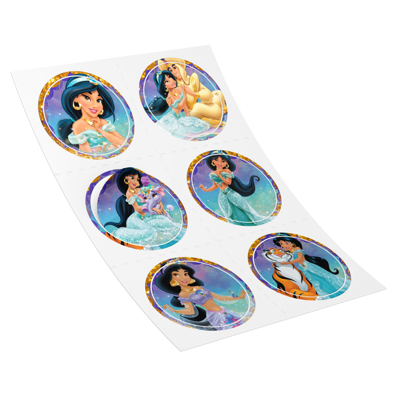 Στρογγυλά αυτοκόλλητα με σχέδιο Γιασμίν για να διακοσμήσεις τα αντικείμενα του πάρτυ ή να τα δώσεις ως ενθύμιο δώρο στους μικρούς καλεσμένους!