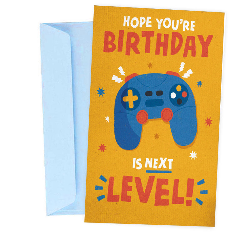 Ευχετήρια κάρτα γενεθλίων "Next Level Birthday" για να ευχηθείς στον φίλο σου που είναι μεγάλος gamer και μεγάλωσε ένα ακόμα Level!