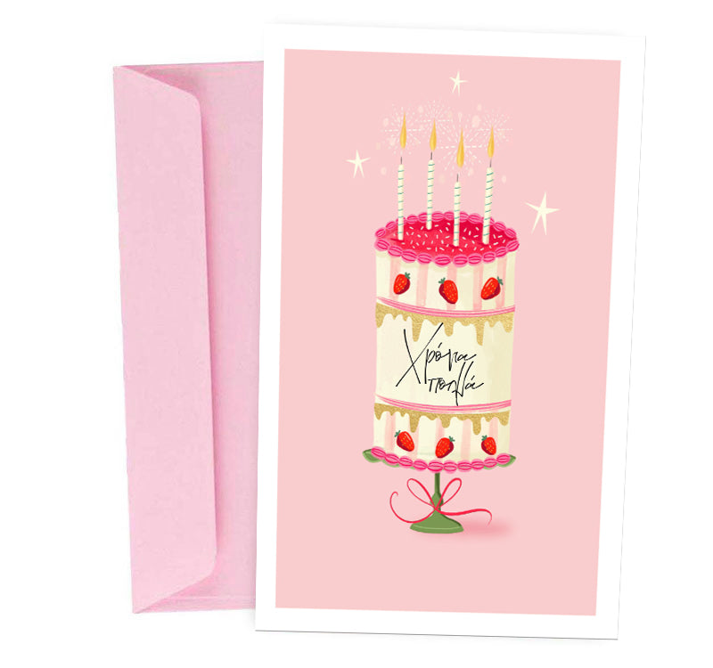 Ευχετήρια κάρτα γενεθλίων "Χρόνια Πολλά" σε ρομαντικό σχέδιο με τούρτα για να ευχηθείς με τον πιο γλυκό τρόπο στους αγαπημένους σου!