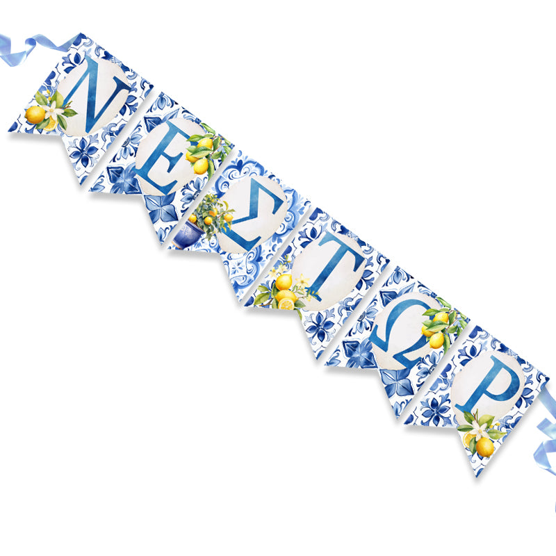 Διακοσμητικά σημαιάκια με θέμα Mediterranean Λεμόνι και το όνομα της επιλογής σας τυπωμένο επάνω για να στολίσετε μοναδικά τον χώρο της βάπτισης!