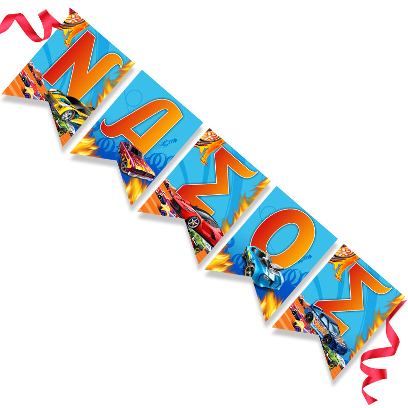 Διακοσμητικά σημαιάκια με θέμα Hot Wheels  και το όνομα της επιλογής σας τυπωμένο επάνω για να στολίσετε μοναδικά τον χώρο του πάρτυ!