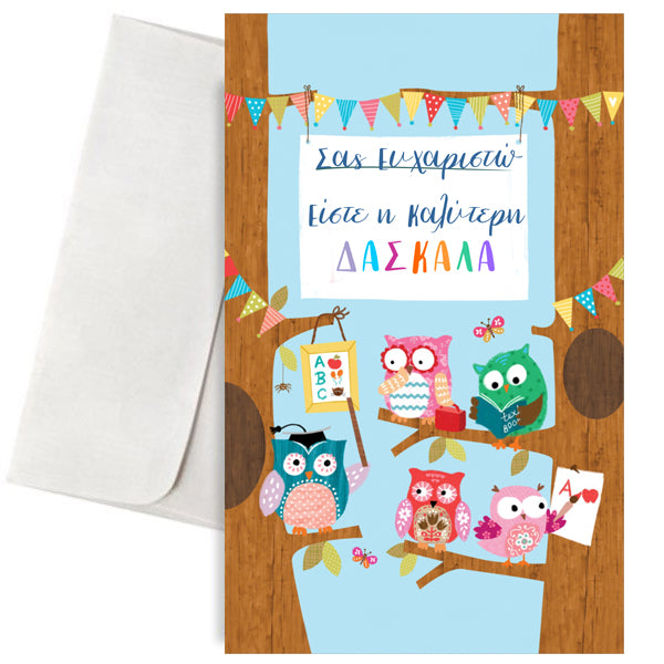 Ευχετήρια Κάρτα με σχέδιο κουκουβάγιες, για να χαρίσετε στην αγαπημένη σας δασκάλα, ώστε να την ευχαριστήσετε για όλα όσα σας έμαθε!