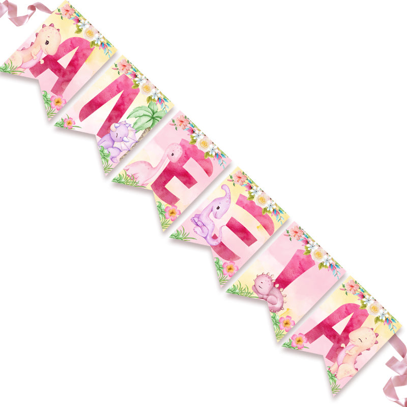 Διακοσμητικά σημαιάκια με θέμα Δεινοσαυράκι κορίτσι και το όνομα της επιλογής σας τυπωμένο επάνω για να στολίσετε μοναδικά τον χώρο του πάρτυ!