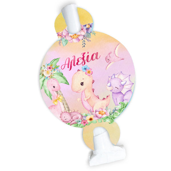 Προσωποποιημένα Blowouts με θέμα Δεινοσαυράκι κορίτσι για να μοιράσεις στους καλεσμένους του πάρτυ και να τους βάλεις σε γιορτινή διάθεση!
