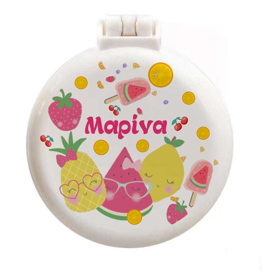 Προσωποποιημένο καθρεφτάκι με χτενάκι και θέμα Tutti Frutti. Το απόλυτο δωράκι για να χαρίσεις στην κάθε καλεσμένη του πάρτυ, με το όνομα της!