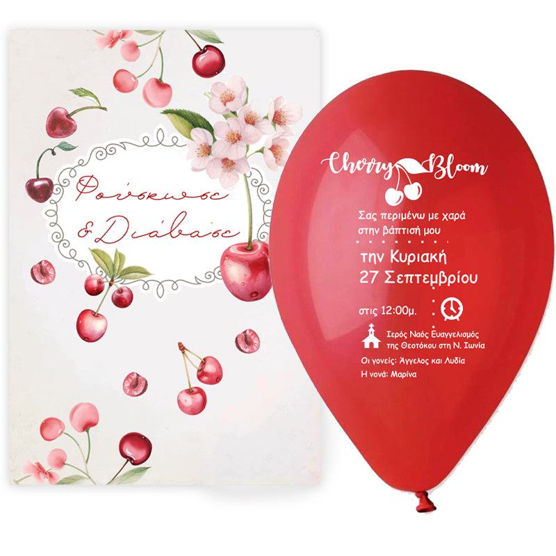 Πρωτότυπο προσκλητήριο βάπτισης σε τυπωμένο μπαλόνι με θέμα Κεράσι. Οι καλεσμένοι θα πρέπει να φουσκώσουν το τυπωμένο μπαλόνι για να μάθουν τις λεπτομέρειες της βάπτισης!