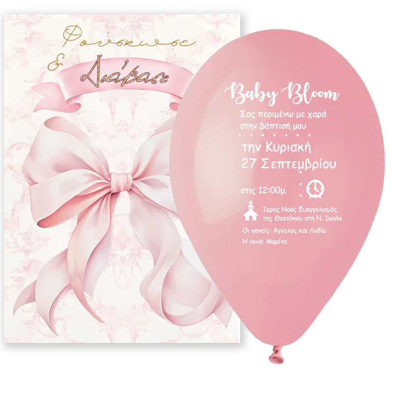 Πρωτότυπο προσκλητήριο βάπτισης σε τυπωμένο μπαλόνι με θέμα Ροζ Φιόγκος. Οι καλεσμένοι θα πρέπει να φουσκώσουν το τυπωμένο μπαλόνι για να μάθουν τις λεπτομέρειες της βάπτισης!