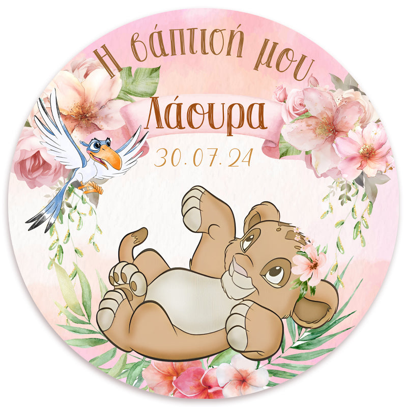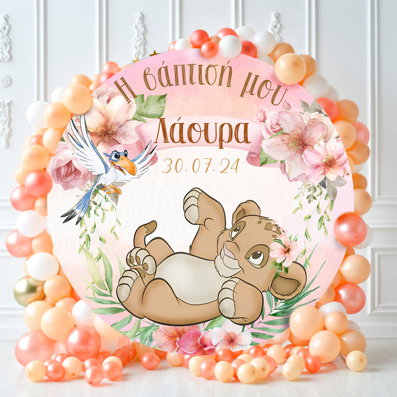 Στρογγυλή αφίσα με θέμα Λιονταράκι και εκτυπωμένο το μήνυμα που θέλετε, για να διακοσμήσετε το χώρο της βάπτισης του μωρού σας!