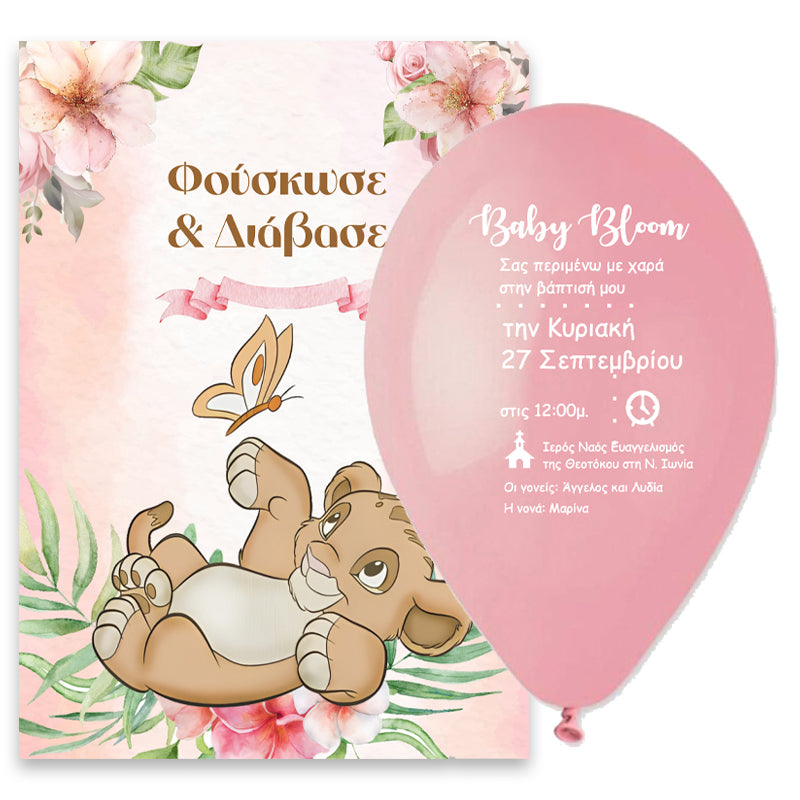 Πρωτότυπο προσκλητήριο βάπτισης σε τυπωμένο μπαλόνι με θέμα Λιονταράκι. Οι καλεσμένοι θα πρέπει να φουσκώσουν το τυπωμένο μπαλόνι για να μάθουν τις λεπτομέρειες της βάπτισης!