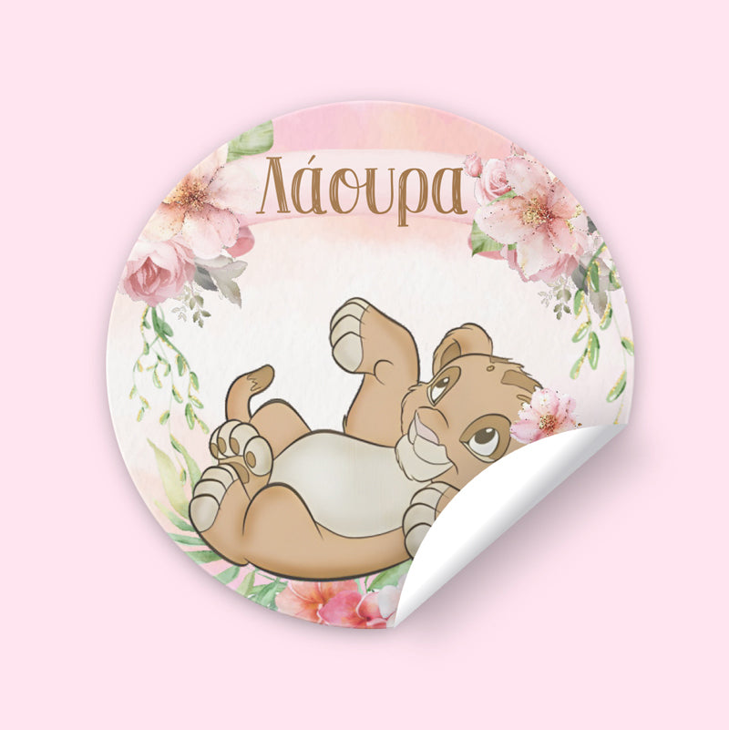 Στρογγυλά αυτοκόλλητα με σχέδιο Λιονταράκι για να διακοσμήσεις τα αντικείμενα της Βάπτισης ή να τα δώσεις ως ενθύμιο δώρο στους μικρούς καλεσμένους!