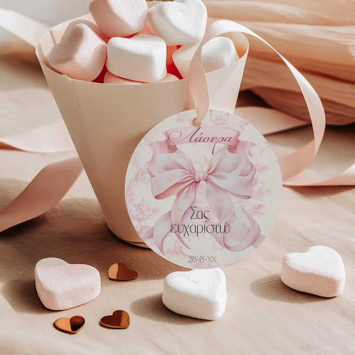 Ευχαριστήριο καρτάκι στρογγυλό για τους καλεσμένους της βάπτισης με θέμα Ροζ Φιόγκος. Για να διακοσμήσεις το μπουφέ ή τα δωράκια των καλεσμένων και να εντυπωσιάσεις.