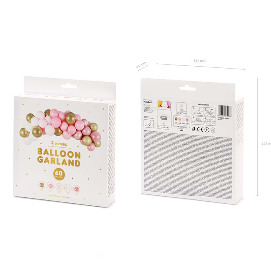- Το σετ περιλαμβάνει 60 παστέλ μπαλόνια (10 shiny χρυσά, 10 παστέλ ροζ, 10 μεταλλικό rosegold, 13 pastel blush ροζ, 17 μεταλλικό άσπρο) και 2.5m διάτρητη ταινία για γιρλάντες μπαλονιών
