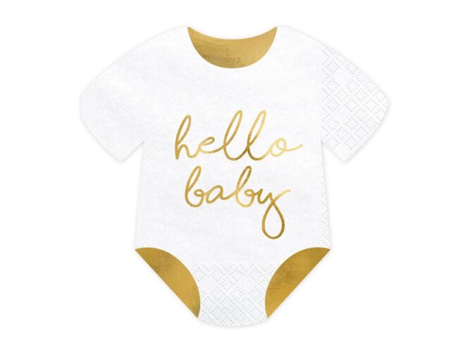 Σχηματικές χαρτοπετσέτες με φορμάκι μωρού Hello Baby με χρυσές ανάγλυφες λεπτομέρειες, για να διακοσμήσετε το μπουφέ του Baby Shower.