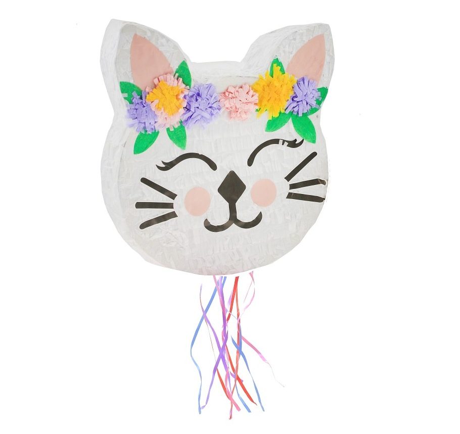 Πινιάτα σε σχήμα κεφάλι Γατούλας με λουλούδια που θα γεμίσει με δώρα, παιχνιδάκια ή καραμέλες. Διαθέτει χερούλι για κρέμασμα και καπάκι που χρησιμοποιείται για να γεμίσει την πινιάτα με γλυκά. Όταν τραβάτε τις κορδέλες, η πινιάτα θα αδειάσει το περιεχόμενό της!