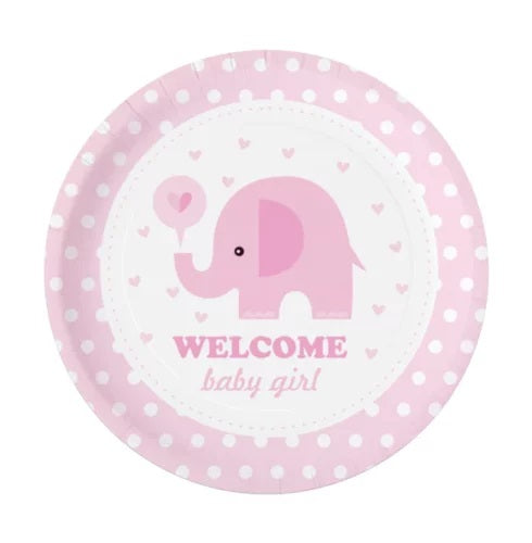 Πιάτα με ροζ Ελεφαντάκι και μήνυμα Welcome Baby Girl, για το μπουφέ του Baby Shower ή της βάπτισης.