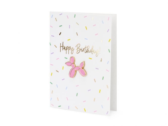 Ευχετήρια κάρτα Happy Birthday και μαζί αποσπώμενη μεταλλική καρφίτσα μπαλόνι-σκυλάκι.