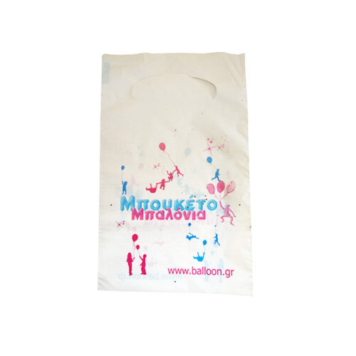 Άσπρη πλαστική σακούλα με λογότυπο και διαστάσεις: 15 x 25cm.