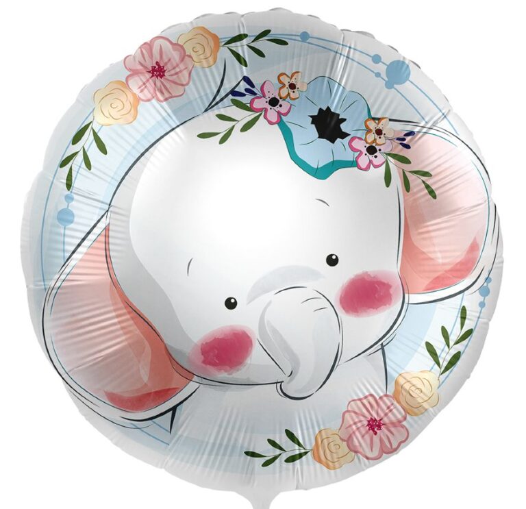 Στρογγυλό μπαλόνι με αξιολάτρευτο Ελεφαντάκι με κόκκινα μαγουλάκια και φλοράλ λεπτομέρειες. Δημιούργησε μια όμορφη διακόσμηση για την υποδοχή του νεογέννητου, τη βάπτιση ή τα πρώτα γενέθλια.