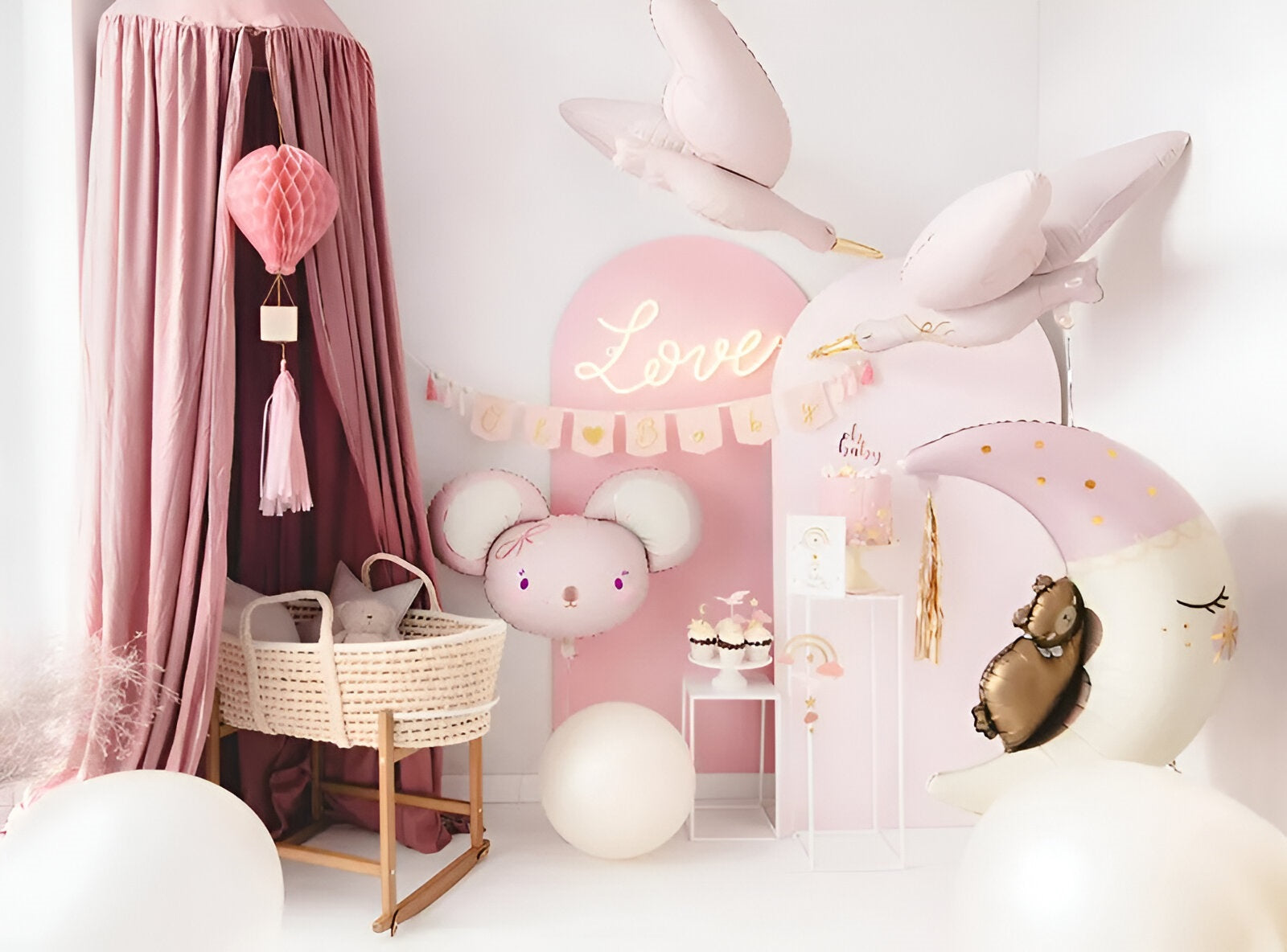 Διακοσμητικό μπάνερ με υφασμάτινα ροζ σημαιάκια, φουντίτσες και χρυσά γράμματα Oh baby, για το στολισμό του Baby Shower ή του πάρτυ γενεθλίων!