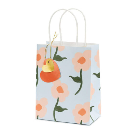 Τσάντα δώρου με λουλουδάκια και δύο ταμπελάκια σε σχήμα καρδιάς, για να χαρίσετε σε αυτή τα δωράκια σας.