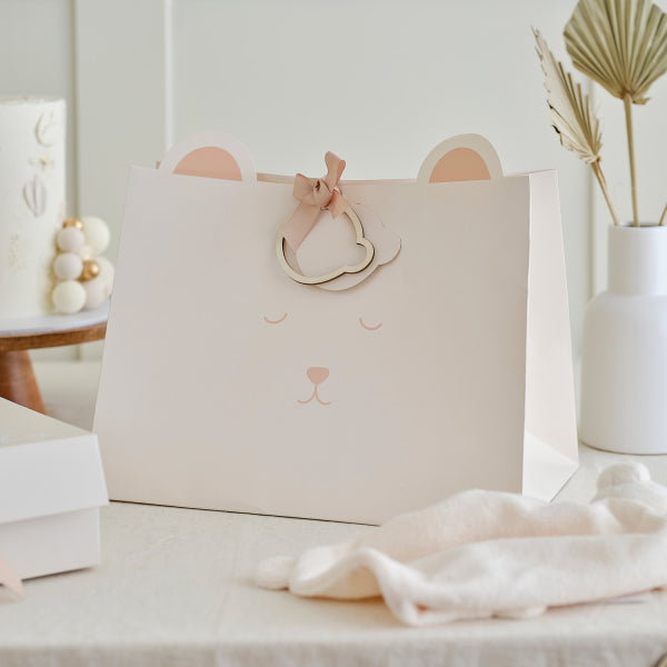Τσάντα δώρου με σχέδιο αρκουδάκι, ιδανική για δώρο στο baby shower ή για χρήση ως τσάντα δώρου για νέους γονείς.