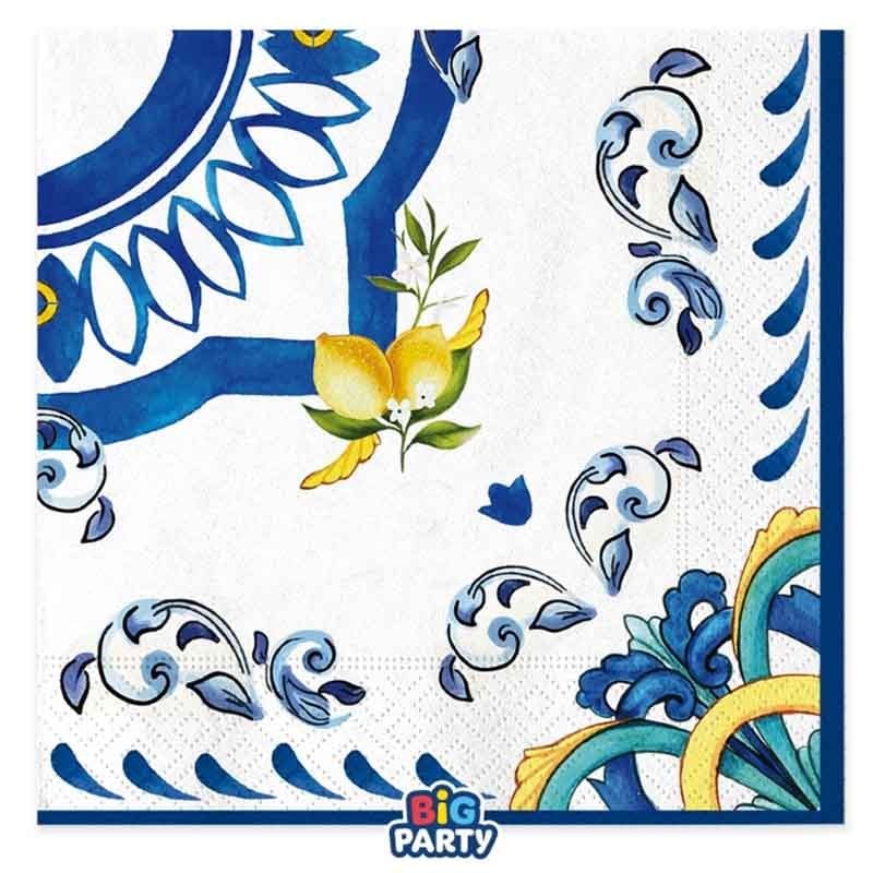 Φέρε μεσογειακή φρεσκάδα στο τραπέζι με χαρτοπετσέτες σε θέμα Amalfi σε σχέδιο λεμόνια με μπλε φόντο.
