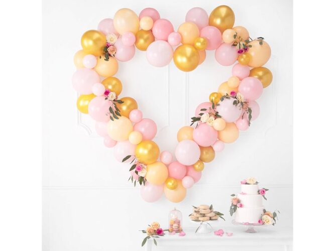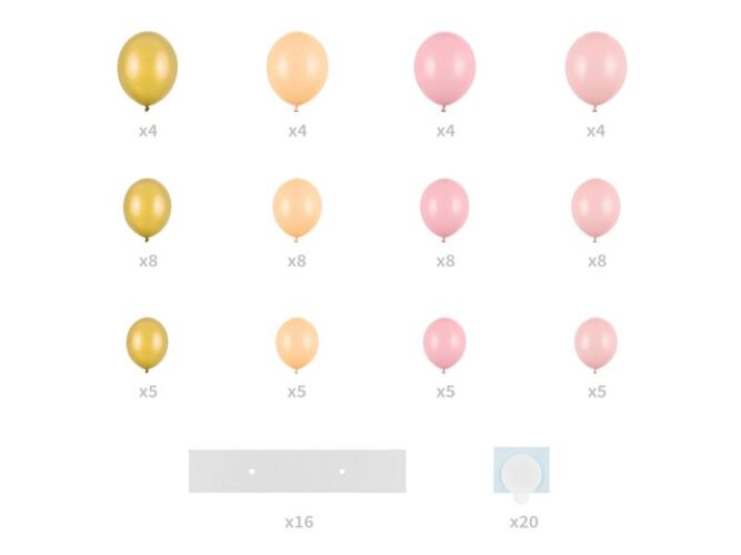 Περιλαμβάνονται: 68 x μπαλόνια (17 x παστέλ λευκά, 17 x παστέλ ροζ, 17 x παστέλ βερικοκί, 17 x μεταλλικά χρυσά), 16 x cardboard από χαρτόνι, 20 x αυτοκόλλητες ταινίες διπλής όψεως, οδηγίες.