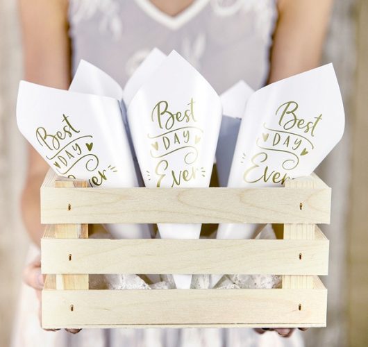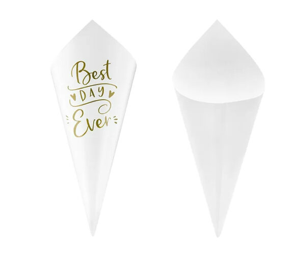 Λευκά χωνάκια με χρυσή εκτύπωση ""Best Day Ever"" . Μοιράστε τα στους καλεσμένους σας για να σας πετάξουν το ρύζι στο γάμο ή κεράστε τους σε αυτά ζαχαρωτά. Μπορείτε να τα χρησιμοποιήσετε και για τη διακόσμηση στο τραπέζι ευχών.